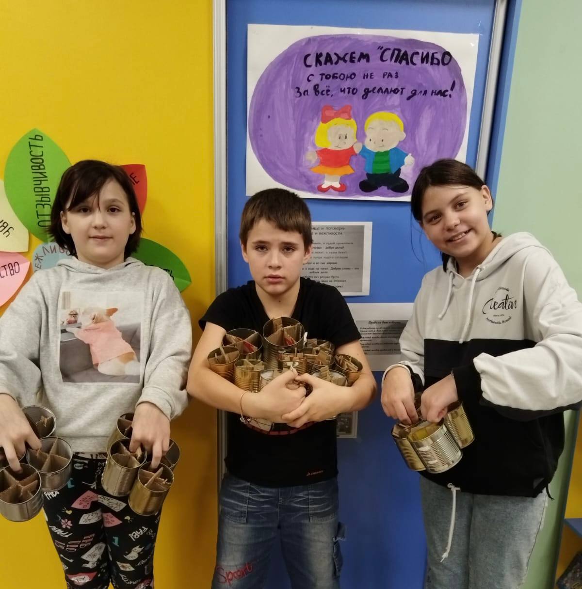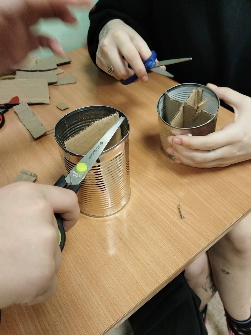 В процессе работы царила атмосфера единения и взаимопомощи. Ребята старательно нарезали картон, скручивали и размещали внутри, раскрашивались и клеили этикетки.