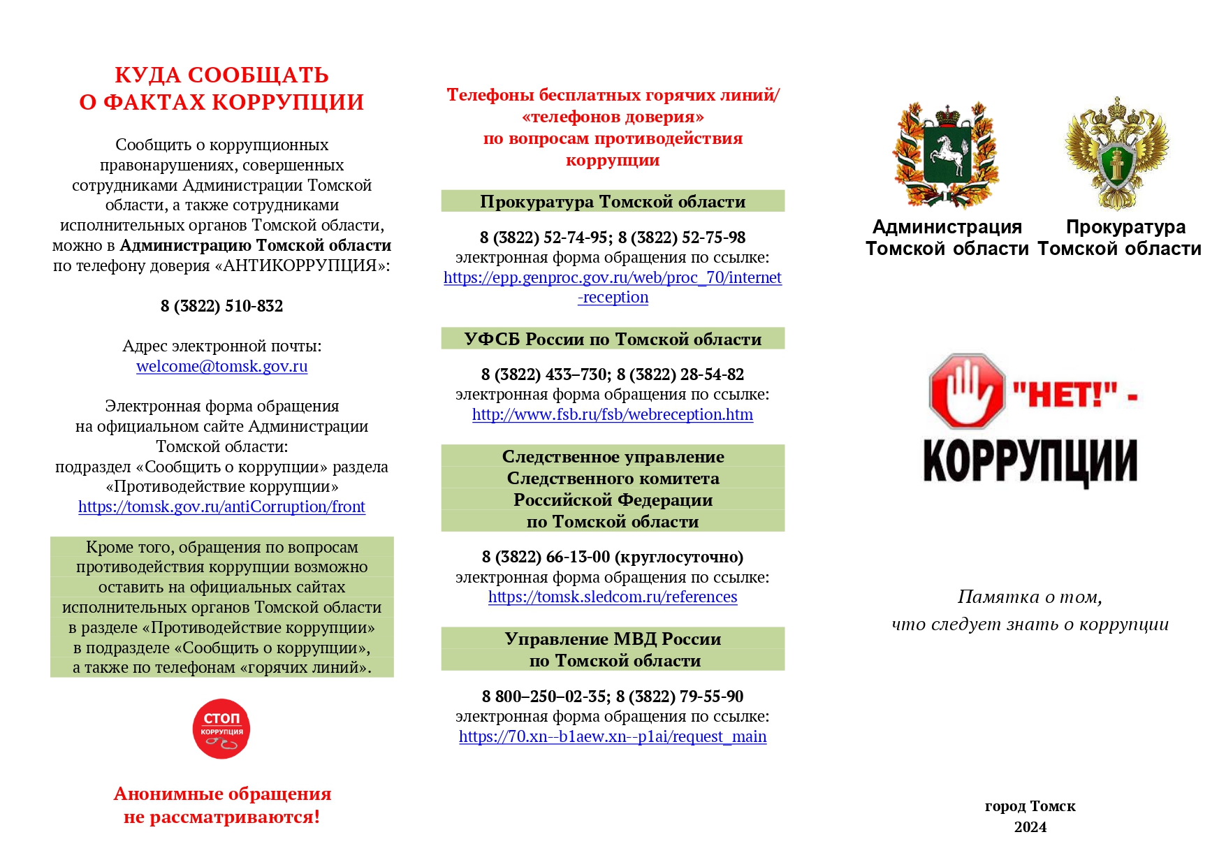 Информацию о фактах коррупции, злоупотреблениях и должностных правонарушениях в органах власти можно сообщить по телефону доверия «Антикоррупция»: 8 (3822) 51-08-32 |