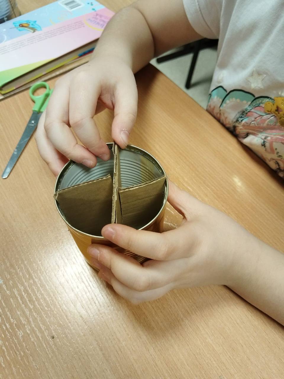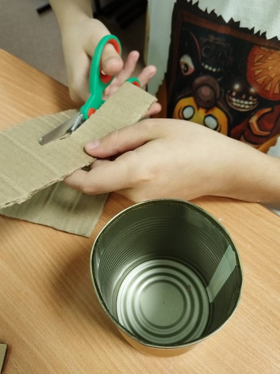 В процессе работы царила атмосфера единения и взаимопомощи. Ребята старательно нарезали картон, скручивали и размещали внутри, раскрашивались и клеили этикетки.